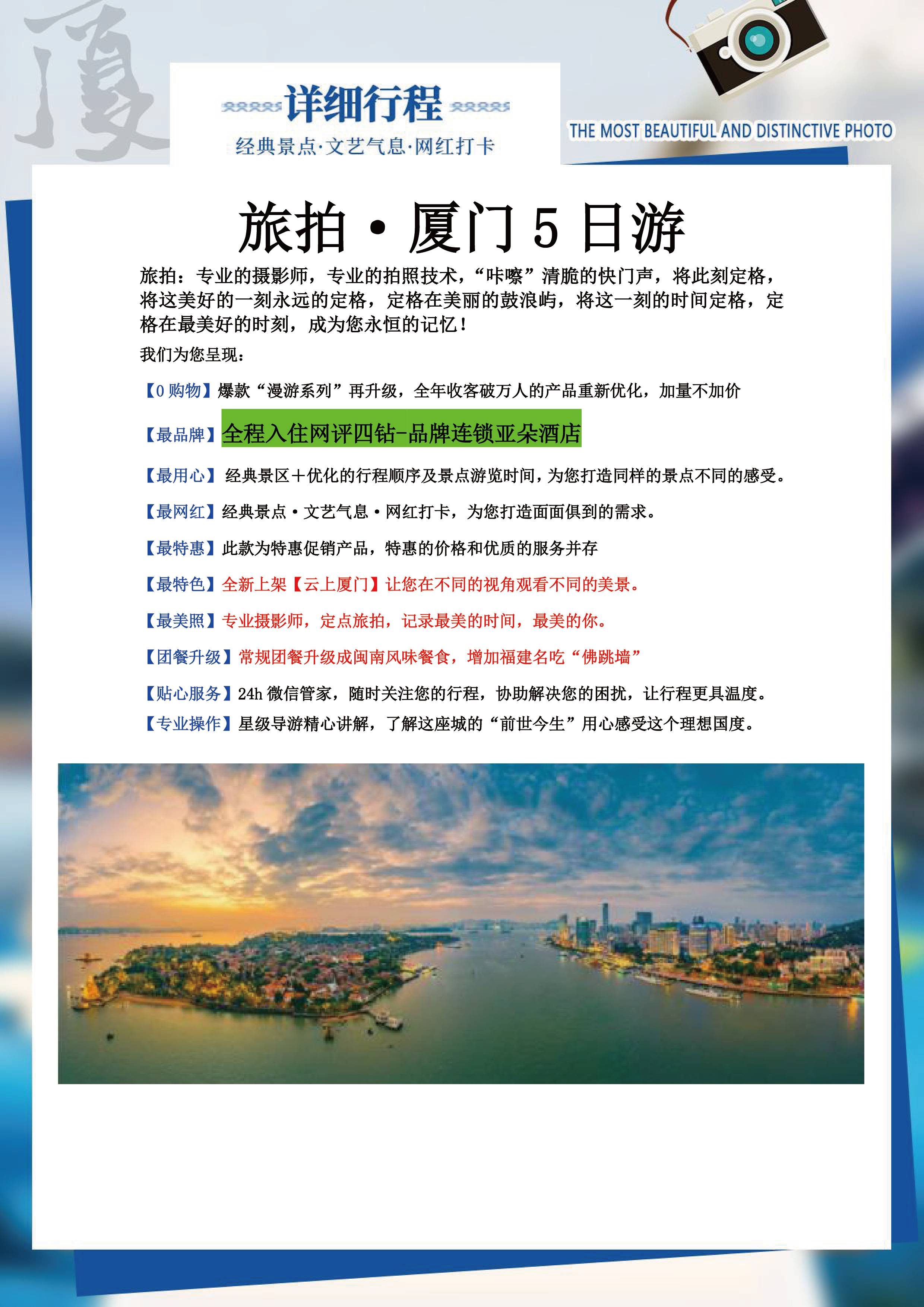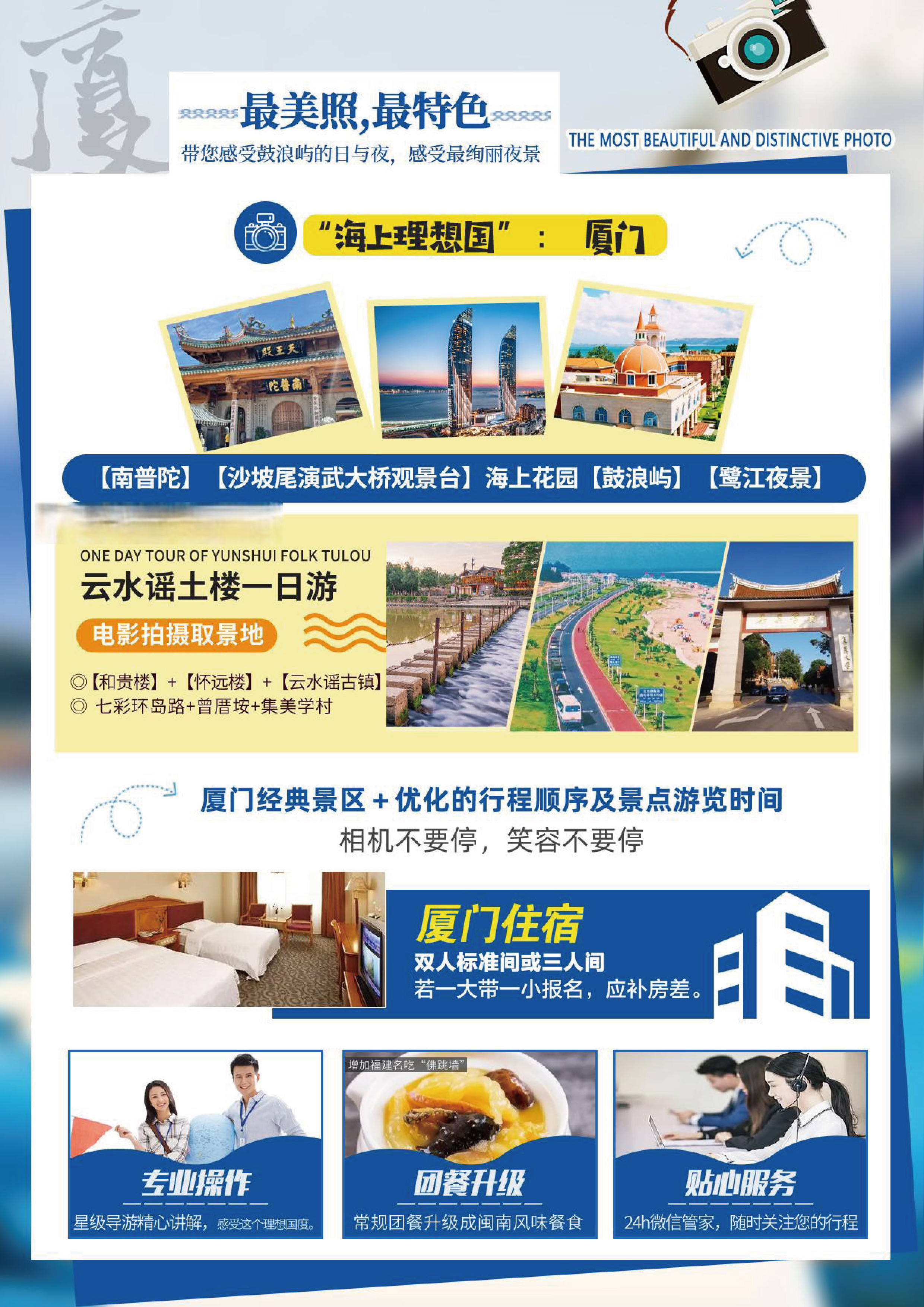 【出团信息】按航班时间提前三小时自行抵达昆明长水机场,办理登机手续乘机前往厦门,师傅接机入住酒店休息;当天自由活动;