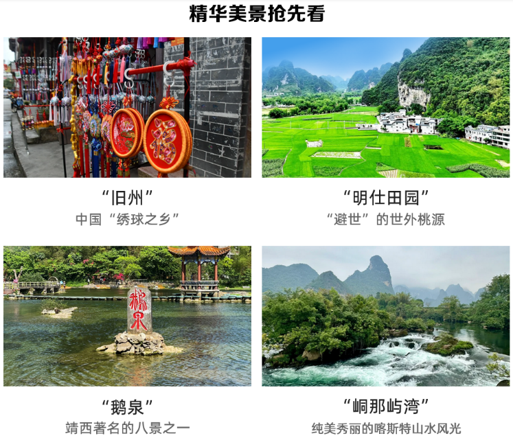 古镇内民风淳朴,游客三三两两,是放松心情的好去处。主街上,你可以看到手工艺人正在制作绣球,这些绣球是纯手工制作的,一天也只能做出1-3个。文昌阁倒映在鹅泉河上,明清老街的青石板记录着马帮蹄印。非遗传承人黄肖琴老人能用12瓣绣球拼出壮锦图腾,镇中心的壮戏台上,末伦调婉转诉说边关往事。漫步田间,春看油菜花海,秋赏金色稻浪,恍若闯入《千里江山图》的实景画卷。