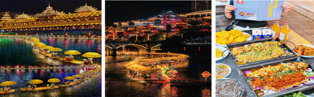 行程结束后,前往宣恩县赏宣恩版“洪崖洞”,夜游【仙山贡水旅游区】仙山贡水旅游区是湖北省唯一一个以县城为核心区域的国家AAAA级旅游景区。核心区域沿贡水河两岸分布,主要景点有:老院子、民族风情街、文澜桥、贡水河音乐喷泉、兴隆老街、墨达楼、苗族钟楼、惹溪街、贡水河国家湿地公园等。景城一体,主客共享的美丽画卷在这里徐徐展开。惹溪街以水为魂,沿河而建,如今也叫“烤活鱼一条街”。晚餐可自行品尝当地特色-宣恩烤活鱼,焦香的鱼皮,嫩滑的鱼肉,浓郁的酱汁,兼具湘菜的麻辣和鄂菜的精髓,入口难忘,享用完美味的仙山烤活鱼后,漫步贡水河畔,可自行乘坐竹筏体验贡水泛舟之乐。还可以自行乘坐景区观光小火车等、品味新春非遗展演、欣赏音乐喷泉,更可以打卡兴隆老街,因为一条鱼,爱上一座城。游览结束后入住酒店。