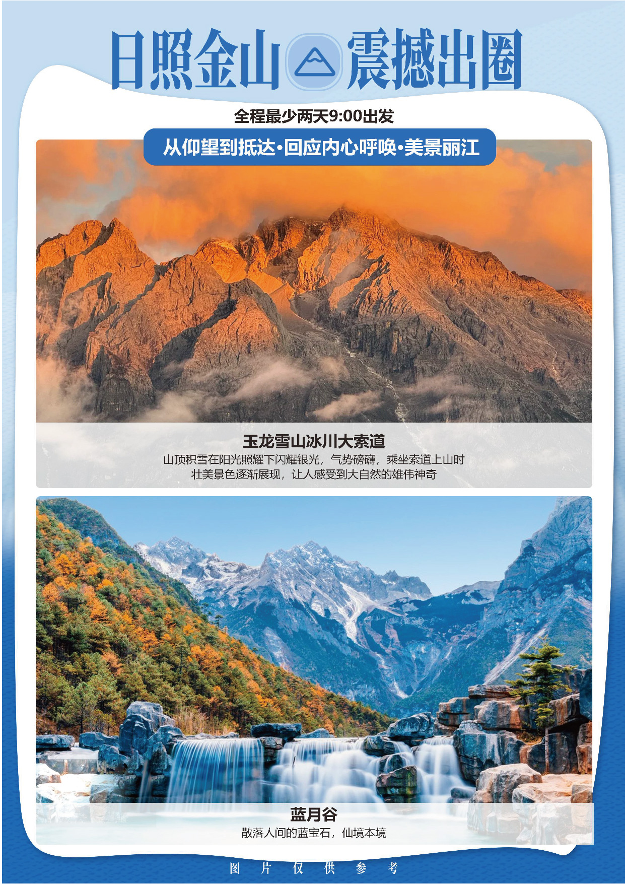 在丽江这片古老的土地上,有着一个流传已久的传说:看到玉龙雪山上的“日照金山”,将会获得一整年的幸运与幸福……当黎明的第一缕阳光穿透云层,轻轻拂过玉龙雪山的峰顶,金色的光辉仿佛唤醒了沉睡的山脉,整个世界都被这瞬间的美丽所震慑,为了迎接这份幸福,感受这瞬间的震慑,今日早起,第一批前往【玉龙雪山风景区】,偶遇日照金山、靠近光,追逐光,成为光;【玉龙雪山冰川大索道】(含雪山羽绒服租借和小瓶氧气)从海拔3000米的草甸出发,穿越高大挺拔的各种松林杉树,到达4506米高的雪山冰川公园,欣赏大自然恩赐的美景;之后游【蓝月谷】(游览时间约30分钟,已含电瓶车)