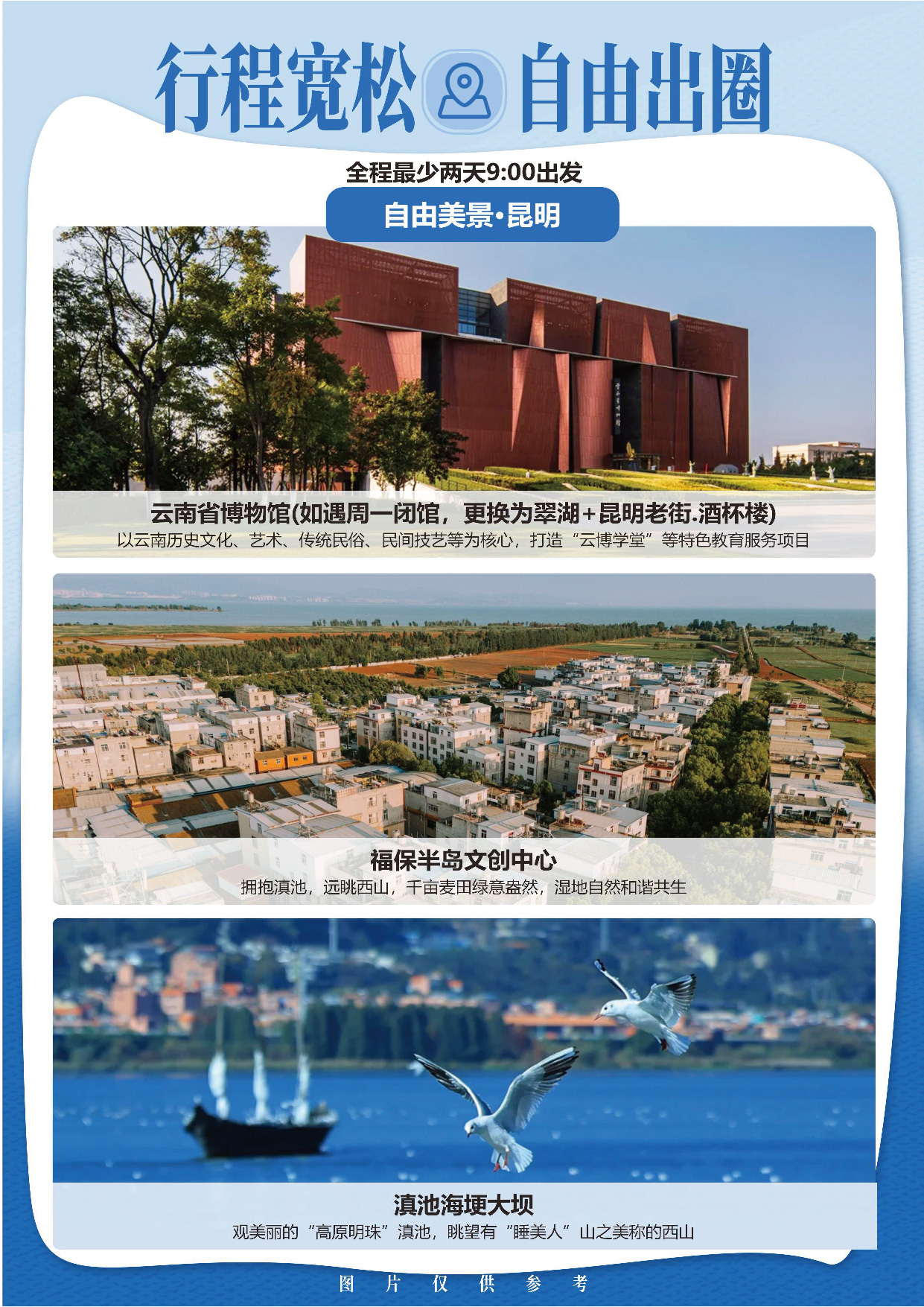 早餐后,乘车前往【云南省博物馆】(周一闭馆),云南省博物馆基本陈列叙述了从远古文明直至云南和平解放的历史发展进程,以文物为引领,首次全面系统地展示了云南各族人民在红土高原创造的厚重历史和辉煌文明,成为广大群众和青年学生了解云南自然地理、历史文化和古代科技的重要殿堂。我馆还不定期推出更多精彩的临时展览,百花齐放、百家争鸣,相信一定能给您不一样的博物馆之旅。(周一闭馆更改为【翠湖+昆明老街.酒杯楼】)。乘车前往昆明的新晋网红打卡地【福保半岛文创中心】,福保半岛文创中心代表了昆明从传统旅游城市向现代化、国际化文旅休闲城市转型的一个缩影。它不再仅仅依赖于自然风光,而是努力将文化、创意和生态深度融合,旨在为人们提供一种更高质量、更有深度的生活方式和旅游体验。