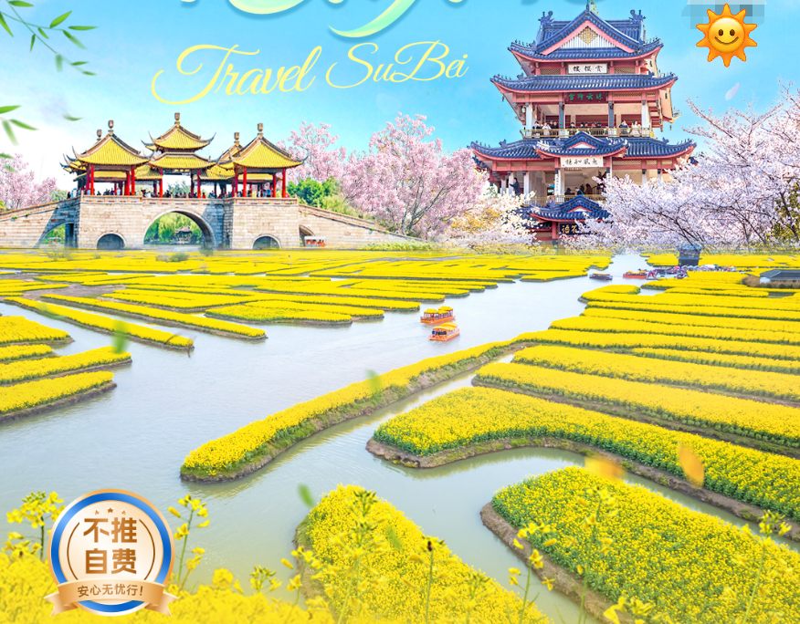 ③漫步金黄花田中 ,浓郁花香让人迷醉 ,旖旎风光令人流连忘返 ,步入花的世界才能全方位体会大自然的美。车赴:“淮左名都””烟花三月下扬州“——扬州(车程约2小时);